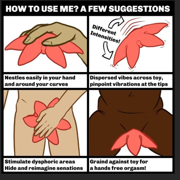 Description: Starsi comes from a starsun, a planet covered in fire, so Starsi loves the warmth of your body. Starsi makes a great vibrator for all surfaces, from genitals to chests, between and beyond. The curves on Starsi's back make an ideal grip, easily palmed in your hand. Transfemme vibrator seekers with genital dysphoria tend to enjoy Starsi for Starsi's ability to cover genitalia with a gently curved vulva-like feel, allowing us to map new genitalia and euphoria in our own mind. You don't have to be transfemme to discover Starsi's pleasures though. Starsi is a sweet and sensual friend.