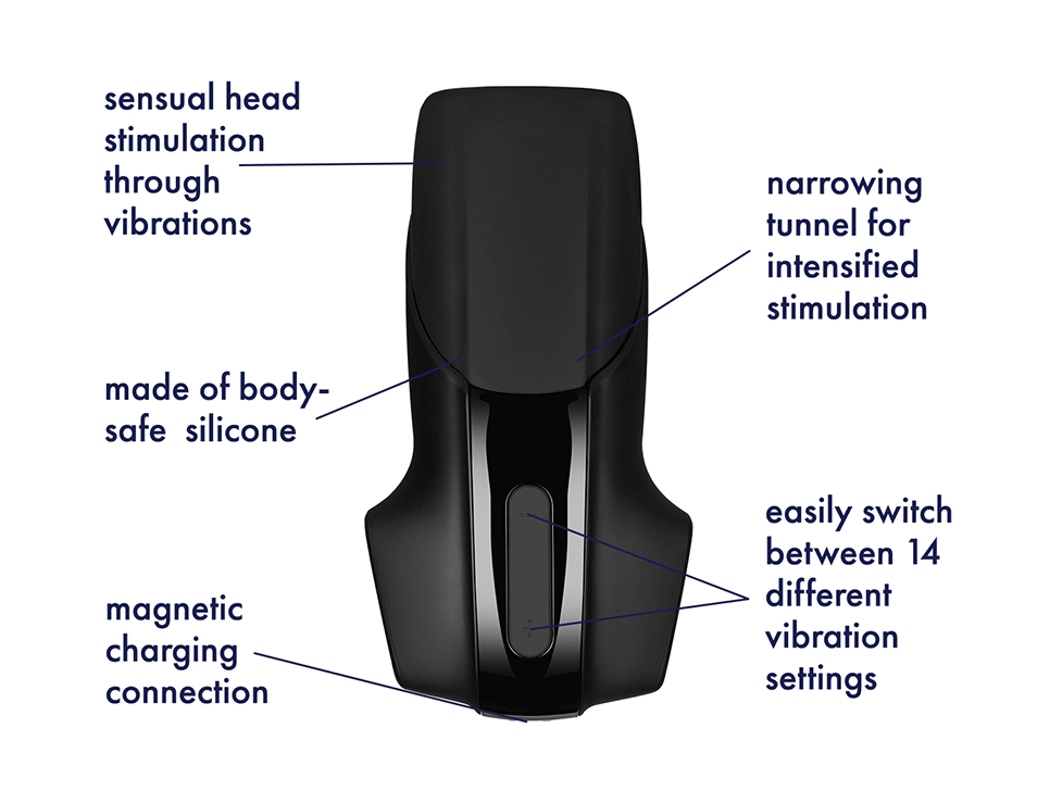 Description: The masturbator with a sophisticated design encloses your penis, spoiling you skilfully with deep vibrations and explosive orgasms. Gone are the days when penis-wielders had to do it themselves - with the Satisfyer Vibration you can sit back and enjoy sexual pleasure the modern way. Depending on your mood, you can choose from 14 tingling vibration programmes, from gentle to wild. With an insertion length of 7 cm, your glans and the front part of your penis will get their money’s worth. Two powerful motors and the ergonomic interior ensure you will have a perfect, pleasurable experience. The different rhythmic programmes simulate oral sex - just the way you like it. Pulsating climaxes with this gem will soon make you forget the world around you.